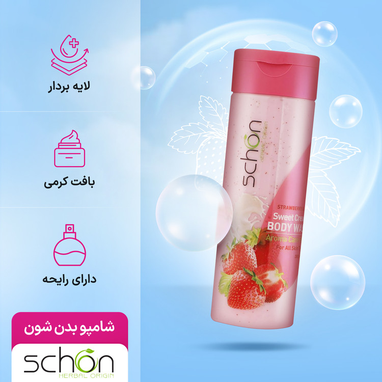 شامپو بدن کرمی شون مدل شیر و توت فرنگی 300 میلی لیتر، شوینده ای لطیف با لایه برداری سبک برای استفاده روزانه است و کمک میکند پوست تمیز، نرم و شاداب بماند. ترکیب پروتئین شیر و روغن سویا در کنار ویتامین B12 و عصاره توت فرنگی، به محافظت از پوست در برابر عوامل محیطی کمک میکند. ذرات اسکراب طبیعی گردو، سلولهای مرده را به آرامی جدا میکند و حس تازگی و رایحه خوش توت فرنگی را روی بدن ماندگار میکند.