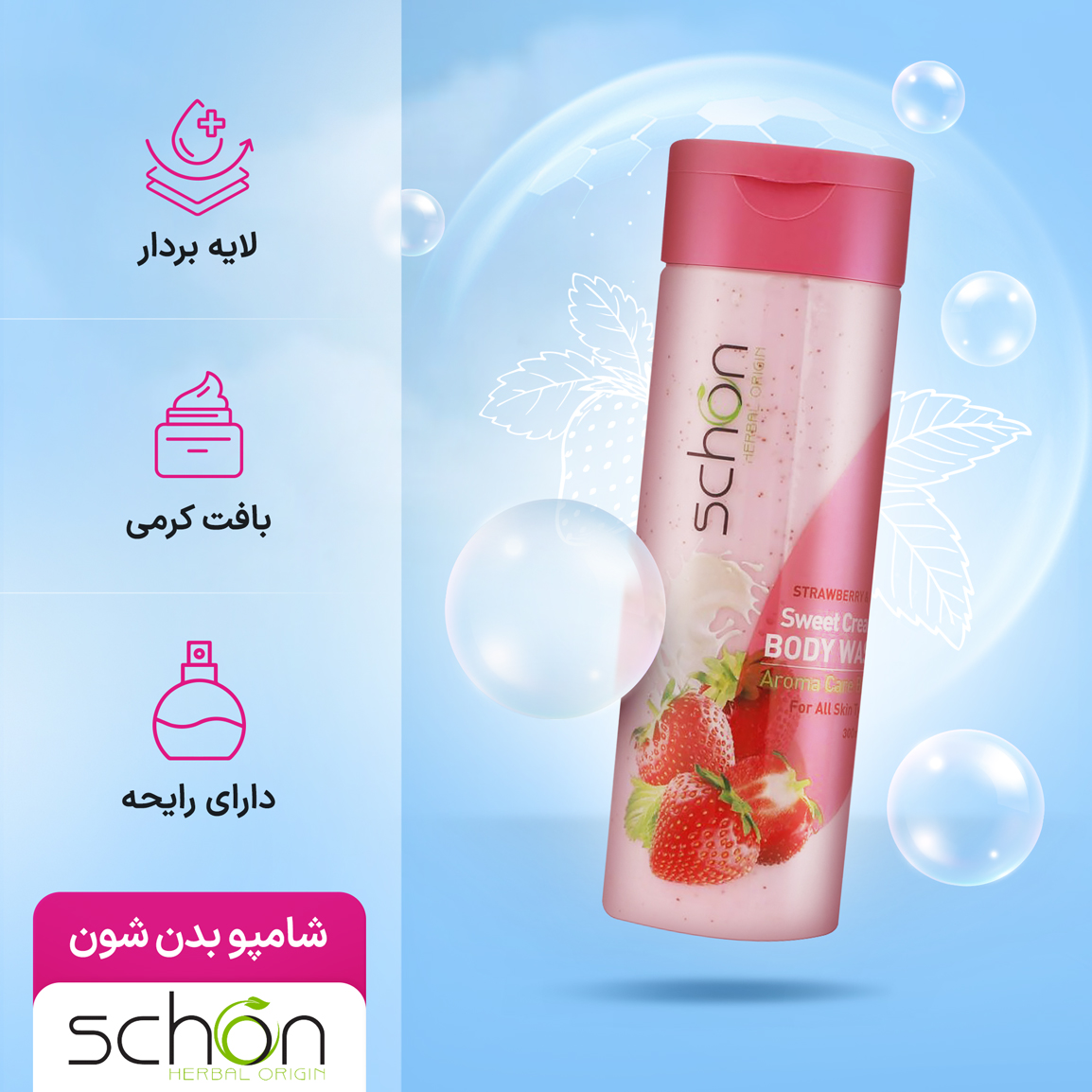 شامپو بدن کرمی شون مدل شیر و توت فرنگی 300 میلی لیتر، شوینده ای لطیف با لایه برداری سبک برای استفاده روزانه است و کمک میکند پوست تمیز، نرم و شاداب بماند. ترکیب پروتئین شیر و روغن سویا در کنار ویتامین B12 و عصاره توت فرنگی، به محافظت از پوست در برابر عوامل محیطی کمک میکند. ذرات اسکراب طبیعی گردو، سلولهای مرده را به آرامی جدا میکند و حس تازگی و رایحه خوش توت فرنگی را روی بدن ماندگار میکند.